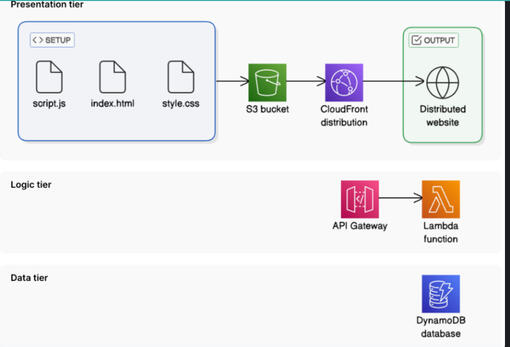A hands-on project focused on building a serverless three-tier web application on AWS. Developed and deployed a static frontend using S3 and CloudFront, built a Lambda-based backend connected via API Gateway, and integrated DynamoDB to manage dynamic user data. Implemented CORS configuration, access permissions, and API integration to ensure secure, scalable communication between presentation, logic, and data tiers.